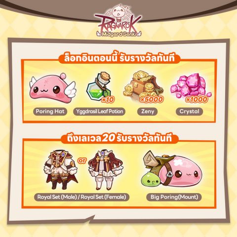 พิเศษสุด! เมื่อ อัปเลเวลตัวละครถึงเลเวล 20 รับโบนัสแพ็กเกจของขวัญสุดเอ็กซ์คลูซีฟเพิ่มทันที ภายในแพ็กเกจประกอบไปด้วย: ชุดเซ็ต Royal และ สัตว์ขี่ Big Poring ที่จะมาเป็นคู่หูสุดแกร่งในการผจญภัยของคุณ!