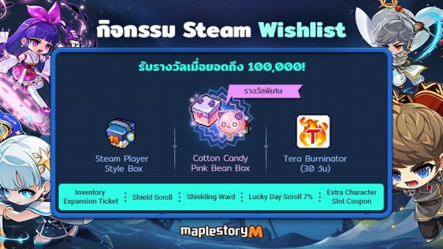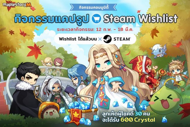 กิจกรรมนี้จะ สุ่มแจก 600 Crystal ให้กับผู้เข้าร่วมกิจกรรม 30 คน เข้าร่วมกิจกรรมได้ง่าย ๆ เพียงเพิ่ม MapleStory M ใน Steam Wishlist แล้วแคปหน้าจอ จากนั้น คอมเมนต์รูป ดังกล่าวใน ประกาศกิจกรรมบน Facebook ทางการ