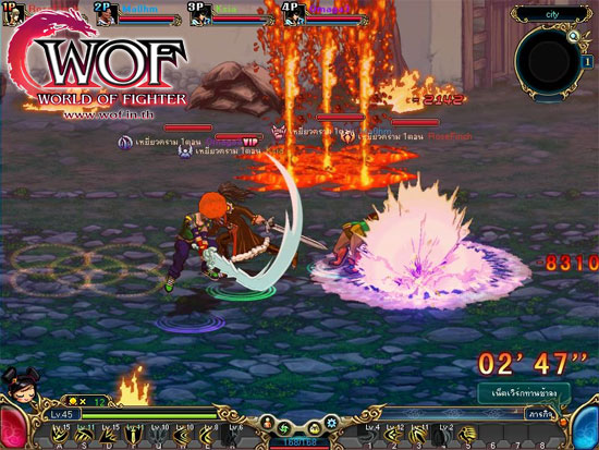 สุดยอดความมันส์อีกหนึ่งรูปแบบในเกม WOF นั่นก็คือการ PK ซึ่งในโลกของ WOF นั้นมีระบบ PK ที่เปิดกว้างอย่างอิสระ สามารถ PK ได้ตลอดเวลาที่ตัวละครของเราอยู่ในเมือง ผู้เล่นจะได้รับอัถรสของการต่อสู้ไปอย่างเต็มๆ เสมือนเวลาเล่นเกม Arcade เนื่องจาก ระหว่างการ PVP นั้น การออกอาวุธท่าไม้ตายต่างๆ ไม่ว่าจะเป็น Skill และ Effect ต่างๆ ต่างทำออกมาได้อลังการและสวยงาม อีกทั้งยังมี Sound Effect ที่ดุดันและเร้าใจ ซึ่งเรากล้าท้าให้คุณได้เข้ามามันกับระบบ PVP ยิ่งถ้าได้ PK กับเพื่อนๆ ในร้านเน็ตแล้วล่ะก็ ทีมงานขอคอนเฟิร์มว่าลุ้นมันส์กันจนตัวโก่งตะโกนลั่นร้านกันเลยทีเดียว