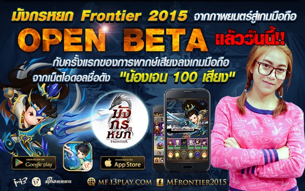 เปิด Open Beta กันสดๆ ร้อนๆ แล้ว เมื่อวันที่ 28 เมษายน 2558 กับเกมมือถือใหม่ มังกรหยก Frontier 2015 เกม Action RPG น้องใหม่ล่าสุดจาก Ini3 ที่พร้อมเปิดให้เหล่าจอมยุทธได้ออกท่องยุทธภพกันอย่างเต็มรูปแบบ อัดแน่นไปด้วยระบบการต่อสู้ขั้นเทพ สุดยอดท่าไม้ตาย และเคล็ดลับวิชาฉบับจอมยุทธ ที่มาพร้อมกับตัวละครจากนวนิยายจีนชื่อดัง “มังกรหยก”