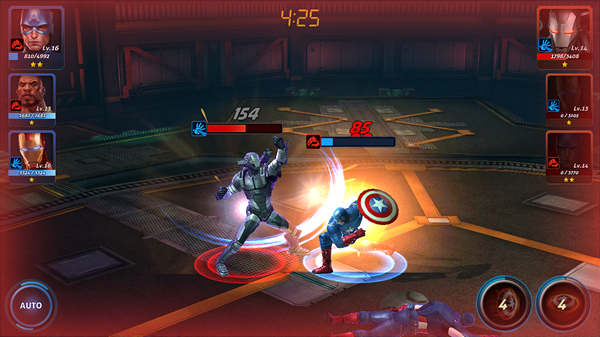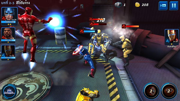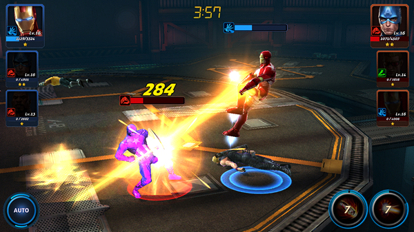 ระบบการต่อสู้นั้นเราจะต้องรวบรวมตัวละครต่างๆ มาจัดทีมโดยทีมเริ่มต้นนั้นเราจะได้รับ ไอรอนแมน กัปตันอเมริกา และ แบล็ควิโดว์ ตะลุยไปตามฉากต่างๆ โดยการบังคับตัวละครนั้นเราสามารถเลือกได้ทั้งแบบใช้การสัมผัสหน้าจอเพื่อ เดิน โจมตี หรือใช้สกิล ส่วนใครที่ถนัดการบังคับแบบ JoyStick ในเกมส์ก็มีระบบ visual joystick ไว้รองรับเช่นกัน