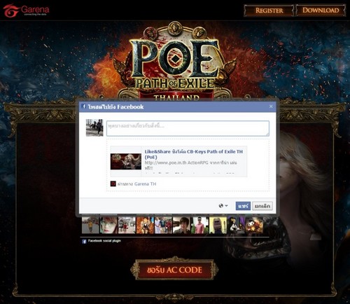 4. กด Like POE Fanpage และกดปุ่มแดง ขอรับ “AC Code”