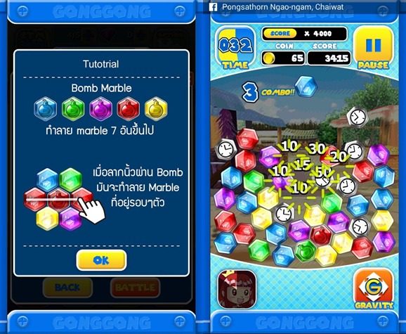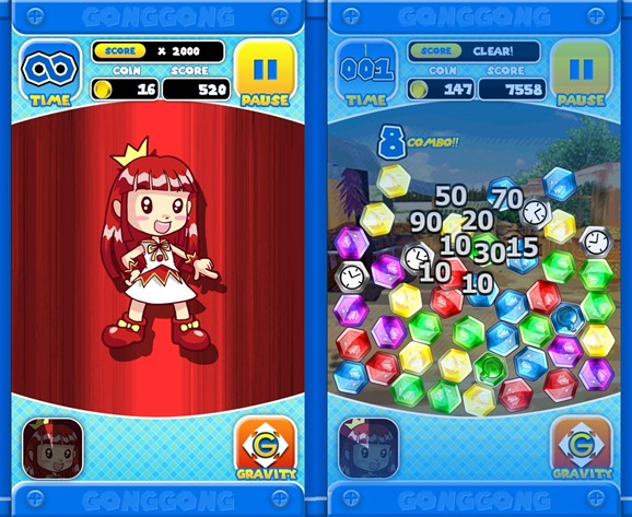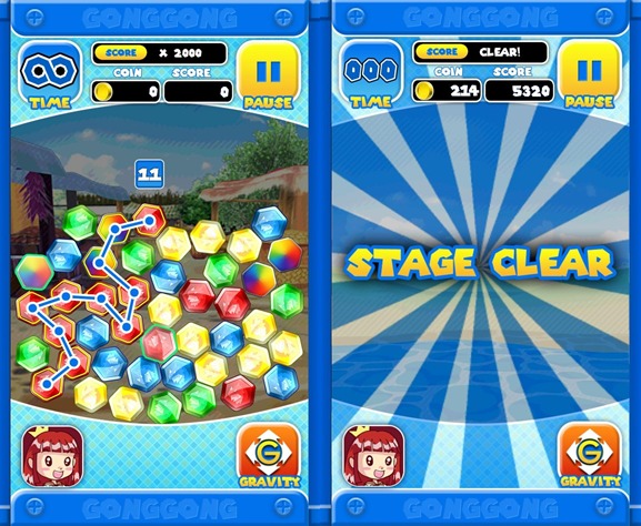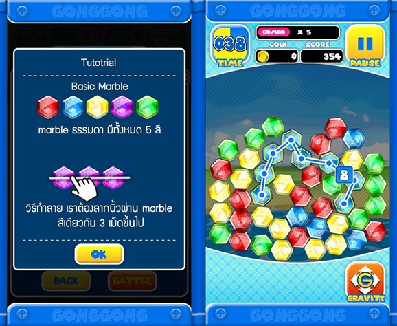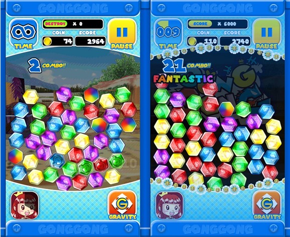 จุดเด่นของเกม Gong Gong นั้นคือเล่นง่ายและเข้าใจไม่ยาก เพียงแค่ใช้นิ้วลากลูกแก้วสีเดียวกันต่อเนื่องกัน 3 ลูก ก็จะสามารถทำลายลูกแก้วได้ทันที