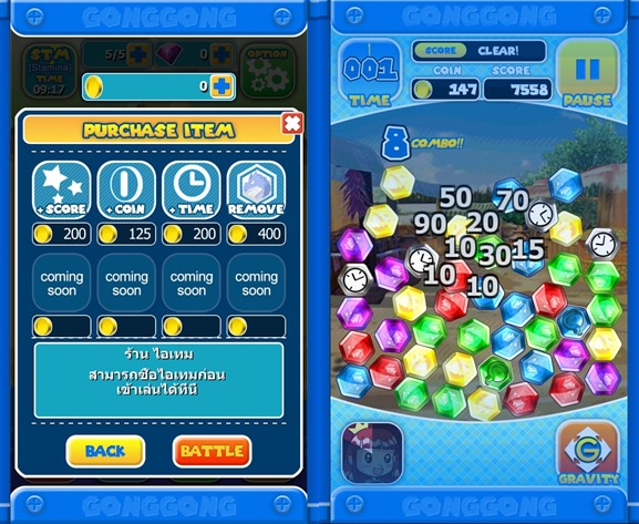 ก่อนเข้าเริ่มฉากเราสามารถซื้อไอเทมเสริมช่วยในการเล่นได้ ต่างๆเช่น เพิ่ม Score เพิ่ม Coin เพิ่มเวลา หรือแม้กระทั่งลดสีเพชรในเกม เพื่อช่วยเพิ่มความสนุกในการเล่นเกมยิ่งขึ้น