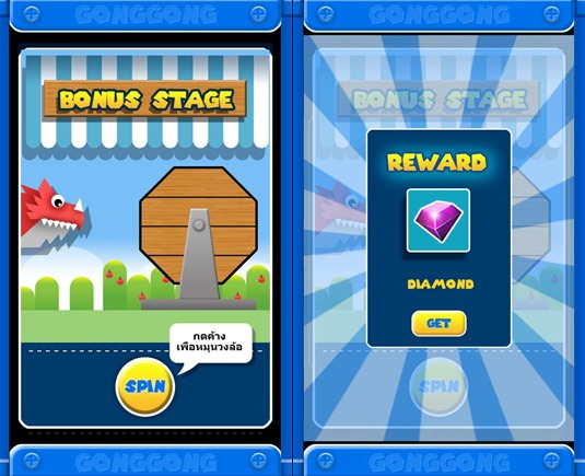 ฟีเจอร์พิเศษของ GongGong โดย Bonus Stage Spin นั้นจะปรากฏหลังจากเคลียร์สเตจได้โดยผู้เล่นจะสามารถหมุนลุ้นของได้สเตจละ 1 ครั้งต่อวันโดยจะมีโอกาสได้ไอเท็มในเกมต่างๆรวมถึงDiamondไปใช้ฟรีๆอีกด้วย