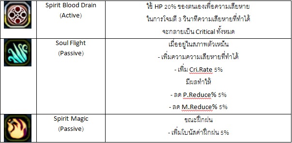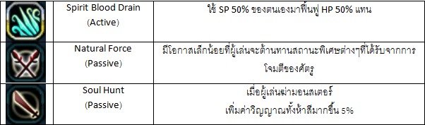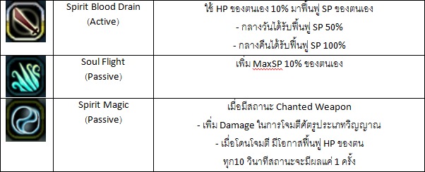 มีจุดเด่นตรงที่ มีสกิล Spirit Blood Drain เสีย HP 10% มาฟื้นฟู SP ให้กับตัวเอง อีกทั้งยังมีสกิล Soul Flight เพิ่ม MaxSP 10% ซึ่งทำให้เผ่า Demon เหมาะแก่การเล่นอาชีพ Mystic Archer สายลูกแก้วเวทย์มาก เพราะสายนี้เป็นสายซัพพอร์ตล้วนๆ จะได้มี SP ไว้ฮีลเพื่อนในทีมรัวๆด้วย และอาชีพ Elementalist สายกริชเวทย์ก็เหมาะด้วยเช่นกัน ส่วนสกิล Spirit Magic หากมีสถานะ Chanted Weapon ทำให้โจมตี ศัตรูประเภทวิญญาณแรงขึ้น และ เมื่อโดนโจมตี มีโอกาสฟื้นฟู HP ของตน