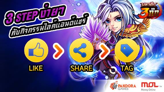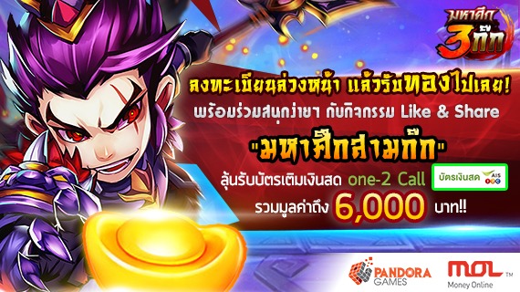 ระหว่างที่รอเกมเปิดให้บริการเดือนเมษายนนี้ มหาศึกสามก๊ก เกมมือถือใหม่จากบริษัท Pandora Games ร่วมกับบริษัท MOL Thailand ขอจัดกิจกรรมคลายร้อนต้อนรับเทศกาลสงกรานต์ให้ร่วมสนุกกันง่ายๆ เพียงแค่ Like & Share วิดีโอ ? มหาศึกสามก๊ก Trailer บนหน้าวอลล์เฟสบุ๊ค แค่นี้ก็ลุ้นรับบัตรเติมเงินสด One-2-Call สนับสนุนโดย MOL กันไปแบบชิลๆ งานนี้ของรางวัลมูลค่ารวมทั้งหมดถึง 6,000 บาท แบบนี้จะพลาดได้ยังไง