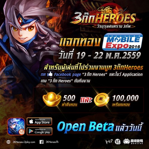 และทั้งนี้ “3 ก๊ก Heroes” วีรบุรุษสงคราม 3 ทัพ เตรียมจัดทัพบุกงาน Thailand Mobile Expo 2016 ภายในบูธของ MOL ณ ศูนย์ประชุมแห่งชาติสิริกิติ์ ระหว่างวันที่ 19 -22 พฤษภาคม 2559 ซึ่งเพื่อนๆ คอเกมมือถือสามารถไปร่วมสนุกกับกิจกรรมพร้อมลุ้นรับไอเทมกันได้เลย