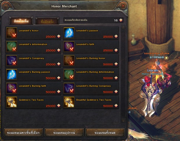 เปิด NPC Lebram ที่เมือง Swordkeeper Town ซึ่งเป็น NPC สำหรับขาย PVP Weapon โดยผู้เล่นสามารถนำ Honor Point ที่ได้รับจากการ PVP มาแลกรับไอเทม