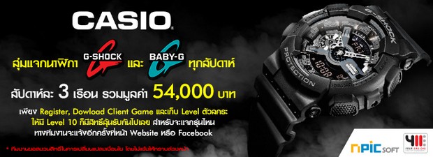 – ทางทีมงานจะทำการสุ่มแจกนาฬิกา G-Shock หรือ Baby-G ทุกสัปดาห์ สัปดาห์ละ 3 รางวัลๆ ละ 1 เรือน รวม 15 รางวัล มูลค่ากว่า 54,000 บาท