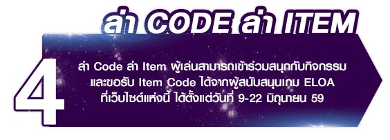 – ผู้เล่นต้องทำการ Register และ Download Client Game ที่หน้า Website: www.eloa.in.th พร้อมเก็บเลเวลตัวละครในเกมให้มี Level 10 ในแต่ละรอบ ก็จะมีสิทธิ์โอกาลุ้นรับรางวัลทันที