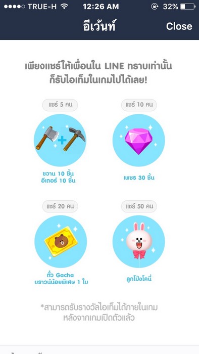 – แชร์ให้เพื่อน 20 คน: รับฟรี ตั๋ว Gacha บราวน์น้อยพิเศษ 1 ใบ
