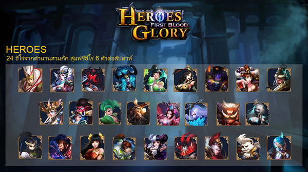 โดยตัวละครในเกมส์ Heroes Glory : First Blood นั้นจะนำ ตัวละครสามก๊ก 24 ตัวละคร มาให้เพื่อนๆ ได้เลือก พร้อมกับ ระบบ Skin ที่เราสามารถเปลี่ยนแปลงรูปลักษณ์ของตัวละครไปได้ตาม Skin ที่เราเลือกใช้ พร้อมระบบอัพเกรดตัวละครหลากหลายทั้งการ อัพเลเวล อัพดาว เลื่อนขั้น นอกจากนั้นยังมีโหมดการเล่นแบบ MMO ที่ให้ลงดันล่าไอเทมมาอัพเกรดตัวละครของเราให้แข็งแกร่งมากยิ่งขึ้นอีกด้วย