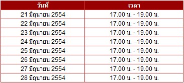 เริ่มวันที่ 21 มิถุนายน 2554 เวลา 12.00 น. – วันที่ 28 มิถุนายน 2554 เวลา 08.00 น.