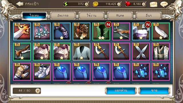 อุปกรณ์ในเกมนี้จะถูกแบ่งระดับจากดีได้แก่ สีขาว>สีเขียว>สีฟ้า>สีม่วง>สีทอง และอุปกรณ์แต่ละชิ้นจะมีเกรด (ความแข็งแกร่ง) ของมันอยู่โดยยิ่งมีดาวมาก เกรดอุปกรณ์ก็จะยิ่งสูง และแข็งแกร่งมากขึ้น