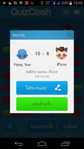 เมื่อจบการประลองจะมีคำสั่งให้แชร์ผลการประลองลง Facebook ตัวเอง โดยคำสั่งโม้ซะหน่อย! หรือจะเล่นอีกครั้งกับคู่แข่งคนเดิมก็ได้ ด้วยปุ่ม เล่นอีกครั้ง