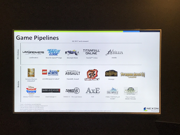 พร้อมกันนี้ทาง NEXON Thailand ยังเผยถึงข้อมูลเกมส์ที่อยู่ในมือของ NEXON ซึ่งยังอยู่การพิจารณาว่าจะเหมาะสมที่จะนำมาเปิดในประเทศไทยหรือไม่ ซึ่งมีหลายเกมส์ที่น่าสนใจทีเดียวไม่ว่าจะเป็น Moonlight Blade, LawBreakers, Astellia, PB Mobile, TOS Mobile, FF XI นอกจากนั้นยังมีเกมส์ฟอร์มใหญ่อย่าง Titan Fall ทั้งเวอร์ชั่น PC และ มือถือ ซึ่งทุกเกมส์ที่กล่าวมานี้ก็มีสิทธิ์เข้ามาเปิดให้บริการในประเทศไทยทั้งสิ้น
