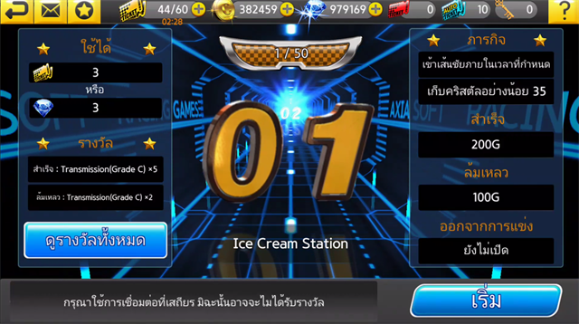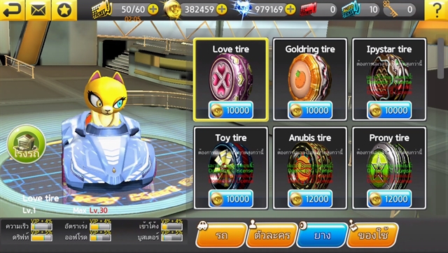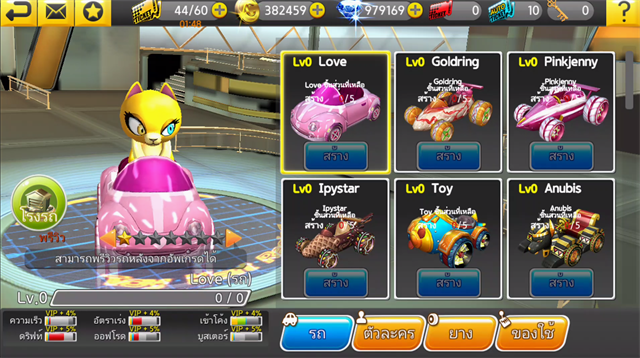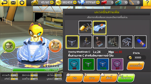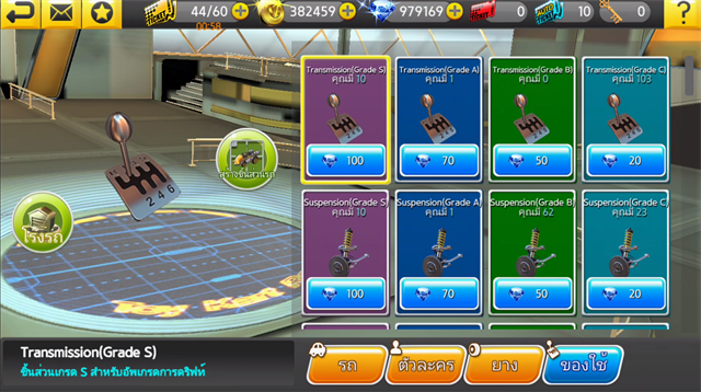 สุดท้ายก็คือ หน้าตาในส่วนของโรงรถ ที่คนเล่นจะสามารถอัพเลเวลรถและปรับแต่งรถ โดยรถในเกมนี้จะเปรียบเสมือนเลเวลตัวละครที่คนเล่นจะสามารถมาอัพเกรดรถให้มีความสามารถสูงขึ้นได้ ซึ่งคนเล่นจะต้องหาชิ้นส่วนมาอัพเกรด แน่นอนว่าใช้เงินในเกมมาอัพเกรดครับ