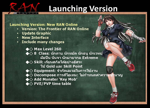 ใน The Frontier of RAN Online จะมีการเปลี่ยนแปลงมากมาย ไม่ว่าจะเป็นการ ยกระดับกราฟิก, ปรับ UI, Max LV 260 มีตัวละครให้เลือก 8 Class นักดาบ, นักหมัด, นักธนู, นักเวทย์มือปืน, นินจา และ นักมายากล Extreme ระบบ Skill ที่สามารถอัพได้อย่างอิสระใช้ Gold และ Skill Point การตีไอเทม ไม่กำหนดค่าความชำนาญอีกต่อไป เพิ่ม Key Mob และ การจัดเวลาในการ PVE/PVP ให้ชัดเจน